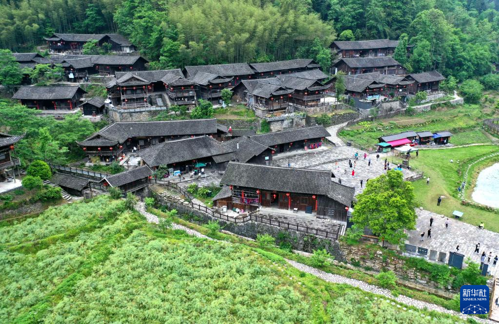 位于湖北省宣恩县沙道沟镇的彭家寨古吊脚楼群历史悠久,吊脚楼保存完好,古朴雅致,是当地民俗文化旅游的热门打卡地(5月2日摄,无人机照片)。