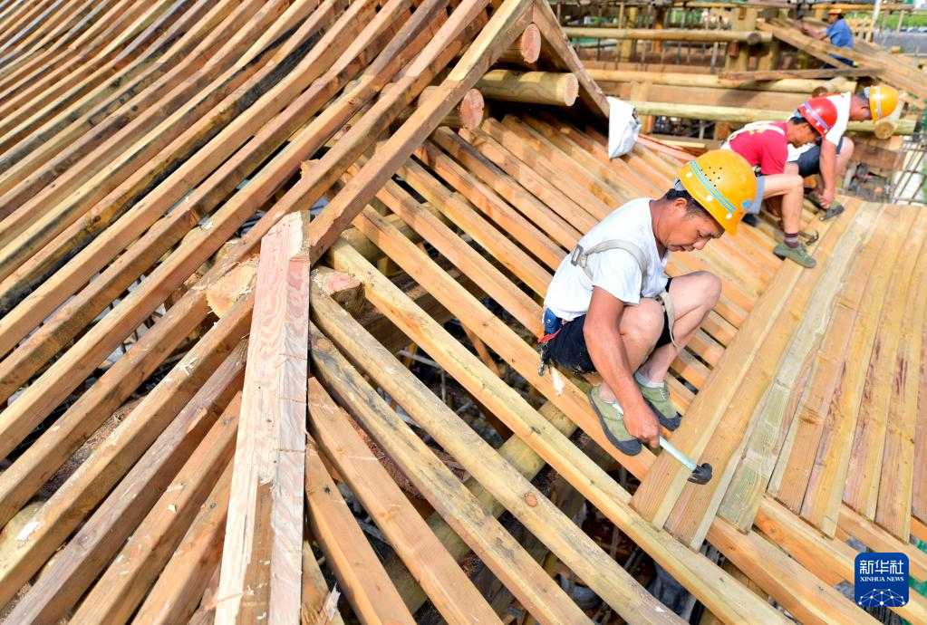 6月10日,木匠在湖北省宣恩县城仙山贡水旅游区修建景观吊脚楼。