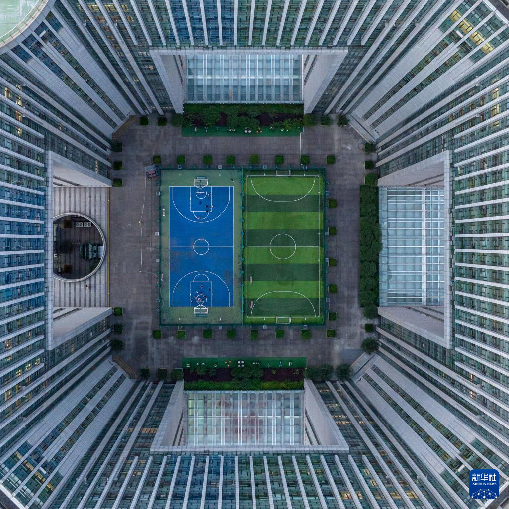 市民在南京市建邺区一处建筑内设置的微型体育场内运动(6月13日摄,无人机照片)。