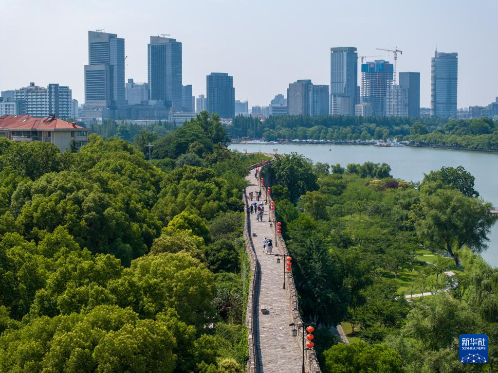 游客在南京城墙北线景区参观游玩(6月12日摄,无人机照片)。