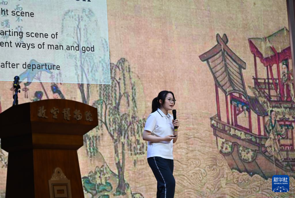 6月19日,北京市第六十五中学学生用双语介绍故宫博物院院藏文物。