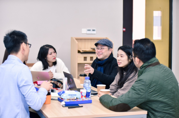 北师大未来设计学院特聘教授叶锦添与学生讨论项目