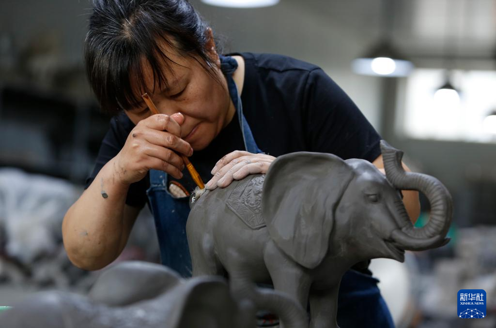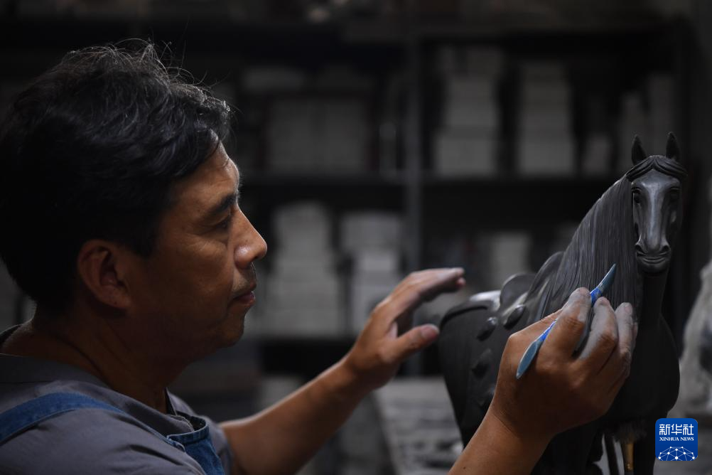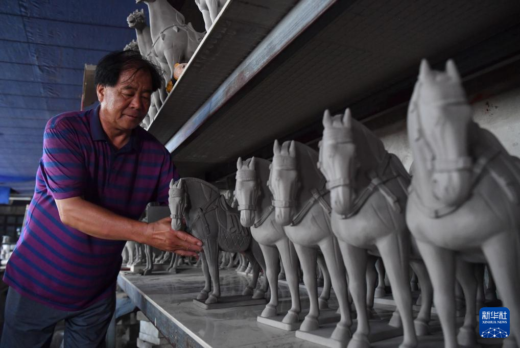 7月19日,在南石山村一家生产企业的车间里,唐三彩艺人高顺旺在雕刻泥胎。