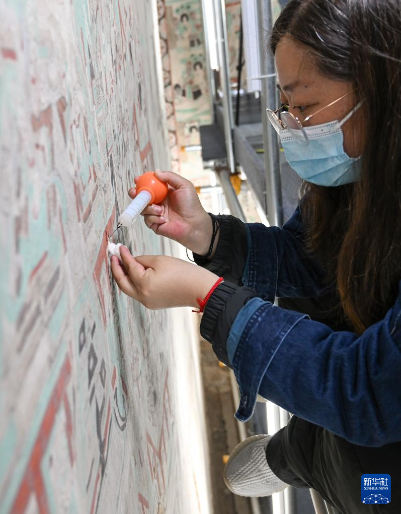 在敦煌莫高窟正在保护修缮的第55窟内,一位文保工作者对壁画进行修复(8月3日摄)。