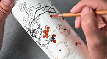 11月21日,一位工艺美术师在唐山市开平区陶瓷文创产业园创作陶瓷绘画作品。