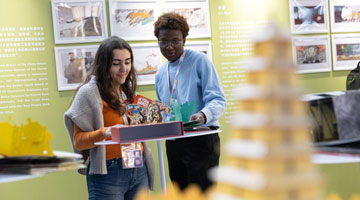 4月10日,在意大利博洛尼亚国际儿童书展上,参观者在中国出版商展台观看立体书。新华社记者 李京 摄