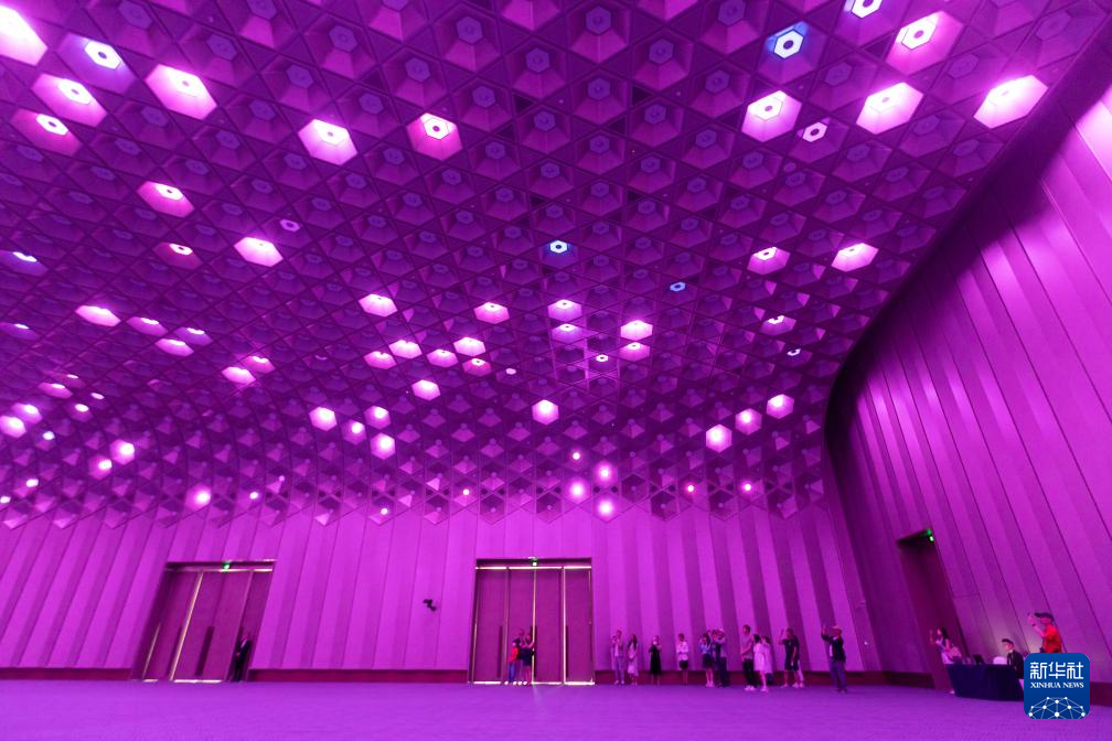 6月16日,市民经过上海世界会客厅内的琉璃多媒体艺术装置墙。