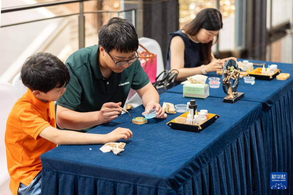 6月16日,市民在上海世界会客厅互动体验区手工制作掐丝珐琅工艺品。