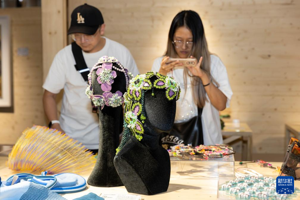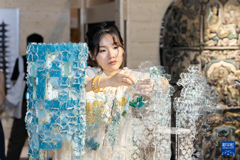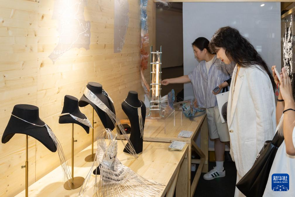 6月19日,观众参观由傣族錾刻工艺制作的银编錾刻系列配饰《云中之城》。