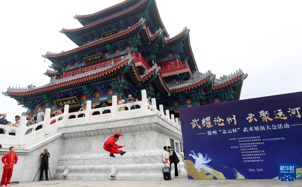 当日,“武耀沧州 云聚运河”武术展演大会在河北省沧州市大运河畔的南川楼文化街区举行,180多位民间武术爱好者为市民和游客带来精彩的武术表演。