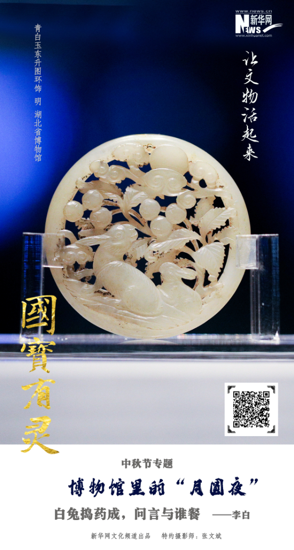 编者按:又是一年中秋节到,值此佳节到来之际,新华网文化频道“国宝有灵”文化IP特推出中秋节专题《博物馆里的“月圆夜”》,精选了六件带有月亮、玉兔等元素的博物馆中的文物,并配有与月有关的诗句,制作成了海报,希望借由这些富有古老文化内涵的国宝珍品,让您感受到传统中秋文化的魅力,为您的节日增添更多意趣,从中体悟到中华优秀传统文化的精髓所在,有所增益,有所感悟。新华网文化频道在此祝您阖家团圆,幸福安康!