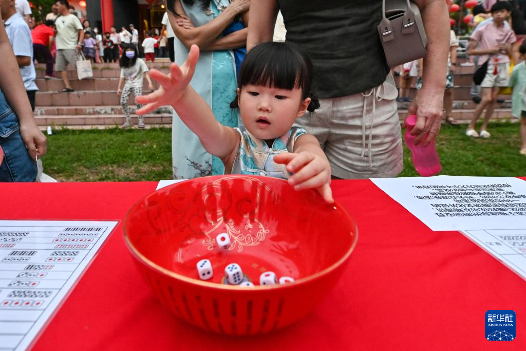 9月14日,在福建厦门一小区内,老少居民一起参加博饼活动。