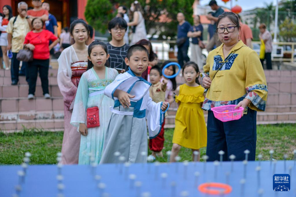 9月17日,在马来西亚雪兰莪州巴生,民众在中秋游园会上参加套圈游戏。