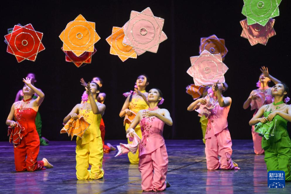 9月21日晚,黑龙江职业艺术学院师生表演舞蹈《绢花迎春》。