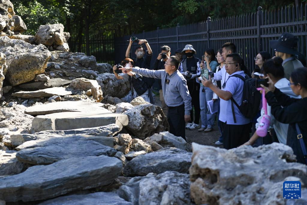 9月22日,北京市考古研究院工作人员向活动参与者介绍文源阁遗址的围墙遗迹。