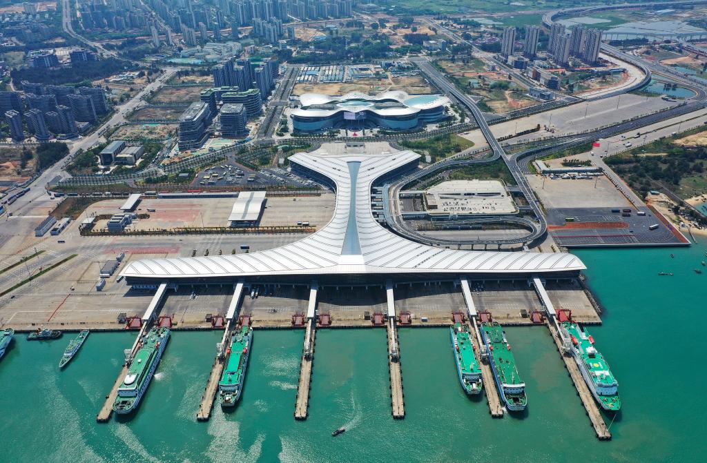 空中俯瞰海口新海港综合交通枢纽站,形如鲲鹏展翅,蔚为壮观。当前,海南自贸港加速封关运作准备,重点口岸设施建设如火如荼。
