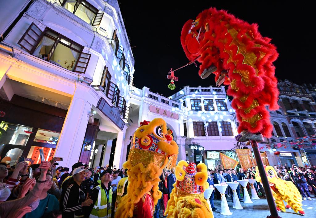 游客在海口骑楼老街观看舞狮表演。新华社记者 郭程 摄