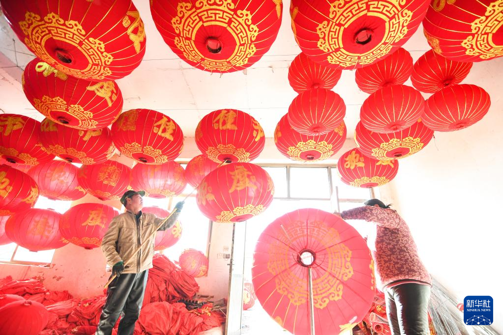 12月16日,在河北省石家庄市藁城区屯头村一家宫灯厂,村民们在制作宫灯。