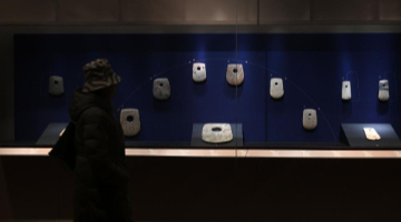 12月16日,在三星堆研究院,考古专家在仔细查看一件青铜面具。