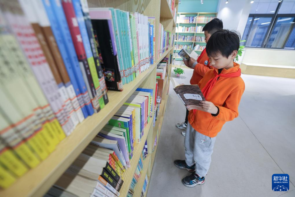 12月18日,学生们在嘉兴市南湖区余新镇中心小学图书馆的“老少阅读攀登合作社图书漂流站”读书。