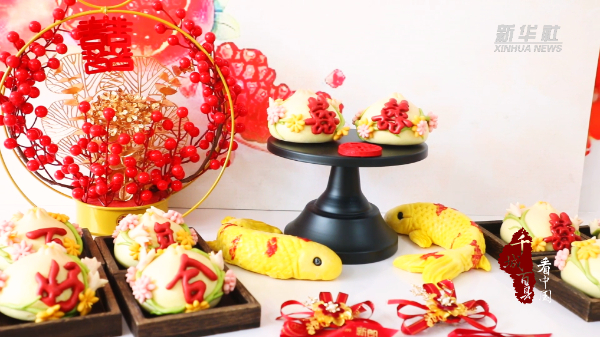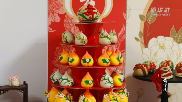 春节临近,山东省枣庄市市中区的喜馍制作师傅们将石榴、福袋等喜庆元素与喜馍制作相结合,制作出“榴红似火”“福禄寿喜”等。柔软细腻的面团在师傅们的巧手下,经过揉、搓、捏、蒸,变身一个个形态逼真、外形俏丽的喜馍面塑。喜馍面塑不仅寄托着劳动人民对美好生活的期盼,更是传播传统民俗文化的载体。