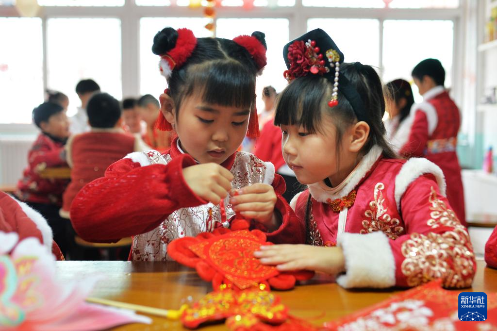 1月14日,在山东青岛北仲路第二小学开展的“国风古韵”迎新春主题活动上,两名学生在给中国结固定线绳。