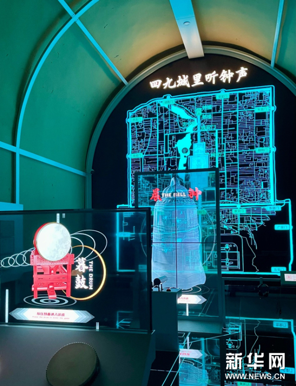 “之后,我们用数字技术和投影创造了全新的沉浸式空间,上演时间的故事。”贺艳介绍说,“大家从这里可以看到从永定门穿梭到钟鼓楼的时间之路;也可以看到暮鼓晨钟,包括日晷等一系列中国人的计量仪器来进行的对时间的表达;还可以看到北京城从元明清都城到中华人民共和国首都的历史,以及钟鼓楼成为北京市文物保护单位、成为全国重点文物保护单位后历经修缮到今天重新开放的历史沿革。这里面非常完整地体现了时间和空间的伟大交汇,观众能够从中感受到时间的流逝,感受到中国人的宇宙观和时间观,感受到古人今人之间的情感共鸣。”