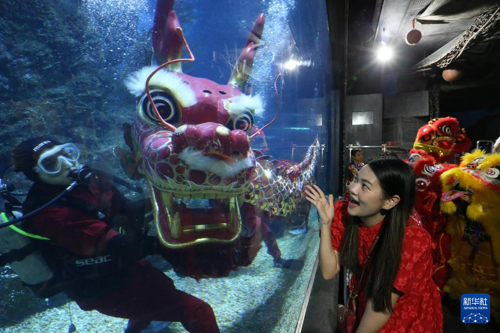 当日,位于泰国曼谷市中心的暹罗海洋世界举办迎新年活动,潜水员在水下表演舞龙,吸引市民前来观赏。