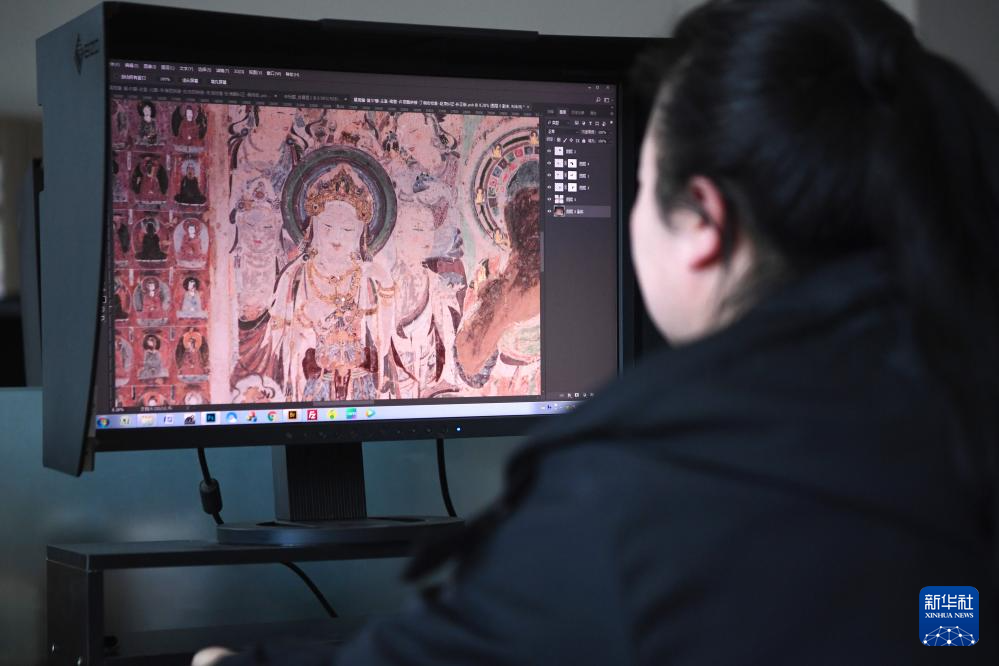 2023年4月25日,敦煌研究院文物数字化保护团队图像处理人员年海丽在拼接壁画图像。