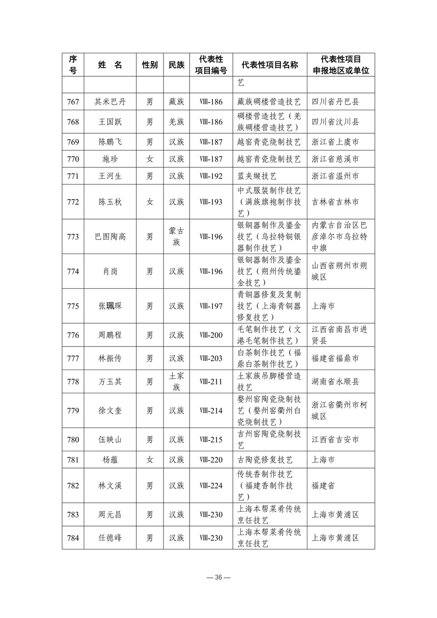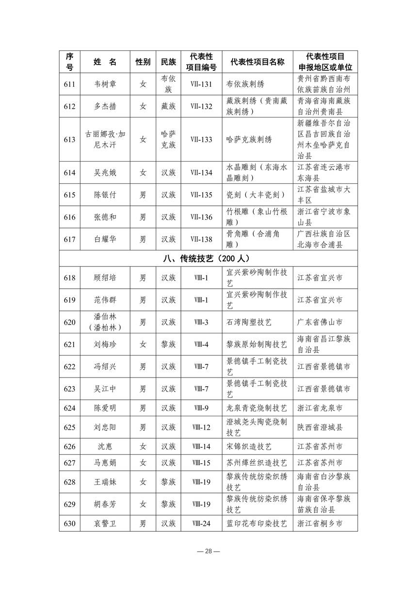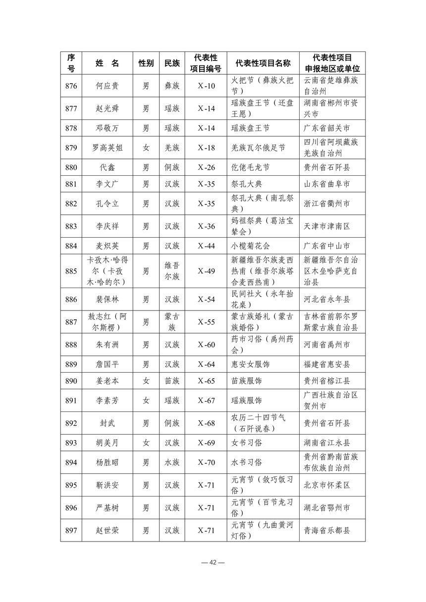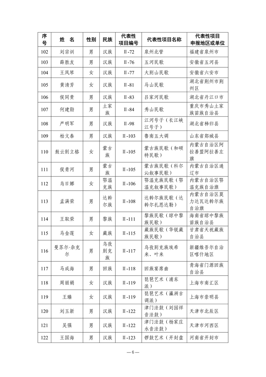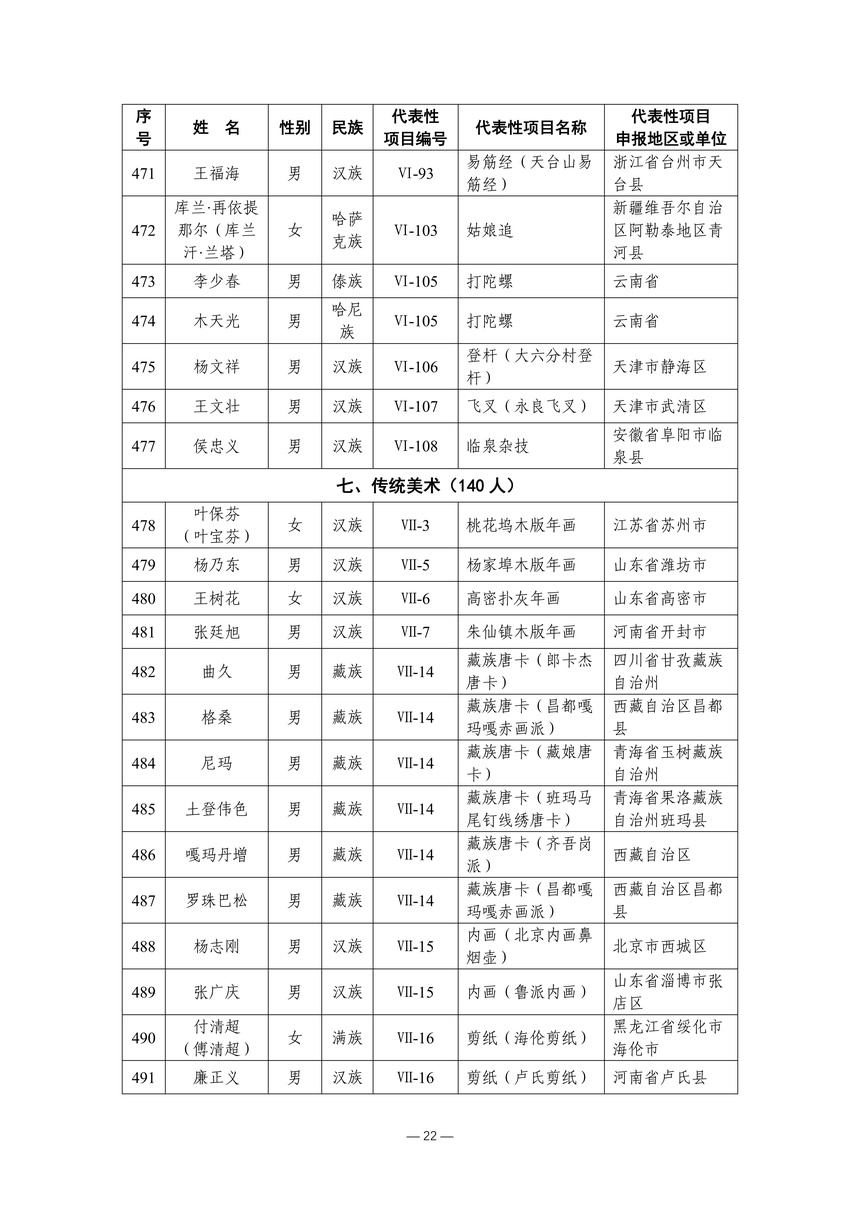 习近平总书记高度重视非物质文化遗产保护传承,强调要积极培养传承人,一代一代接下来、传下去。近年来,各地高度重视非物质文化遗产代表性传承人队伍建设,涌现出一大批德艺双馨、技艺精湛,在非物质文化遗产保护传承中发挥重要作用的典型代表。根据《中华人民共和国非物质文化遗产法》及《国家级非物质文化遗产代表性传承人认定与管理办法》有关规定,为加强非物质文化遗产传承人队伍建设,进一步提升非物质文化遗产系统性保护能力水平,保护和传承好非物质文化遗产,文化和旅游部组织开展第六批国家级非物质文化遗产代表性传承人认定工作。经推荐申报、材料复核、专家初评、社会公示、评审委员会审议等程序,确定了第六批国家级非物质文化遗产代表性传承人名单(942人),现予以公布。