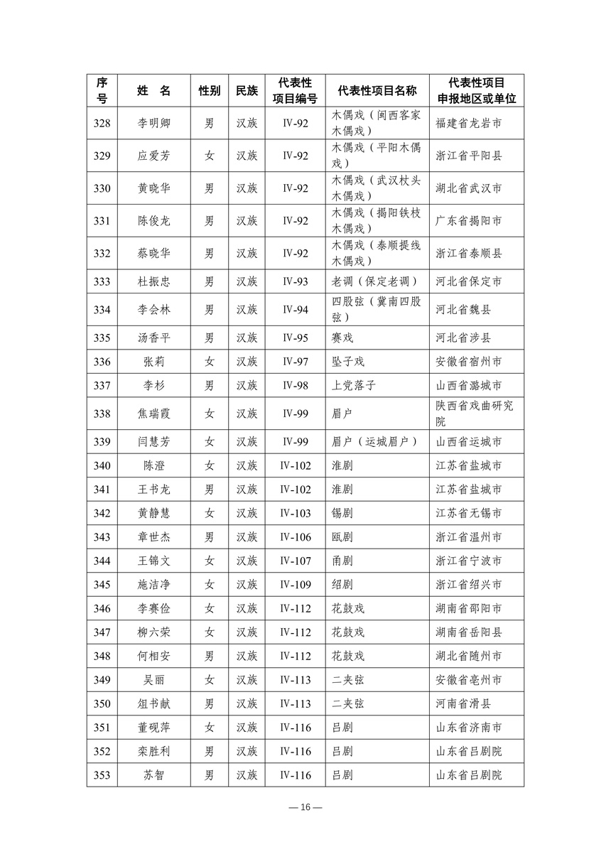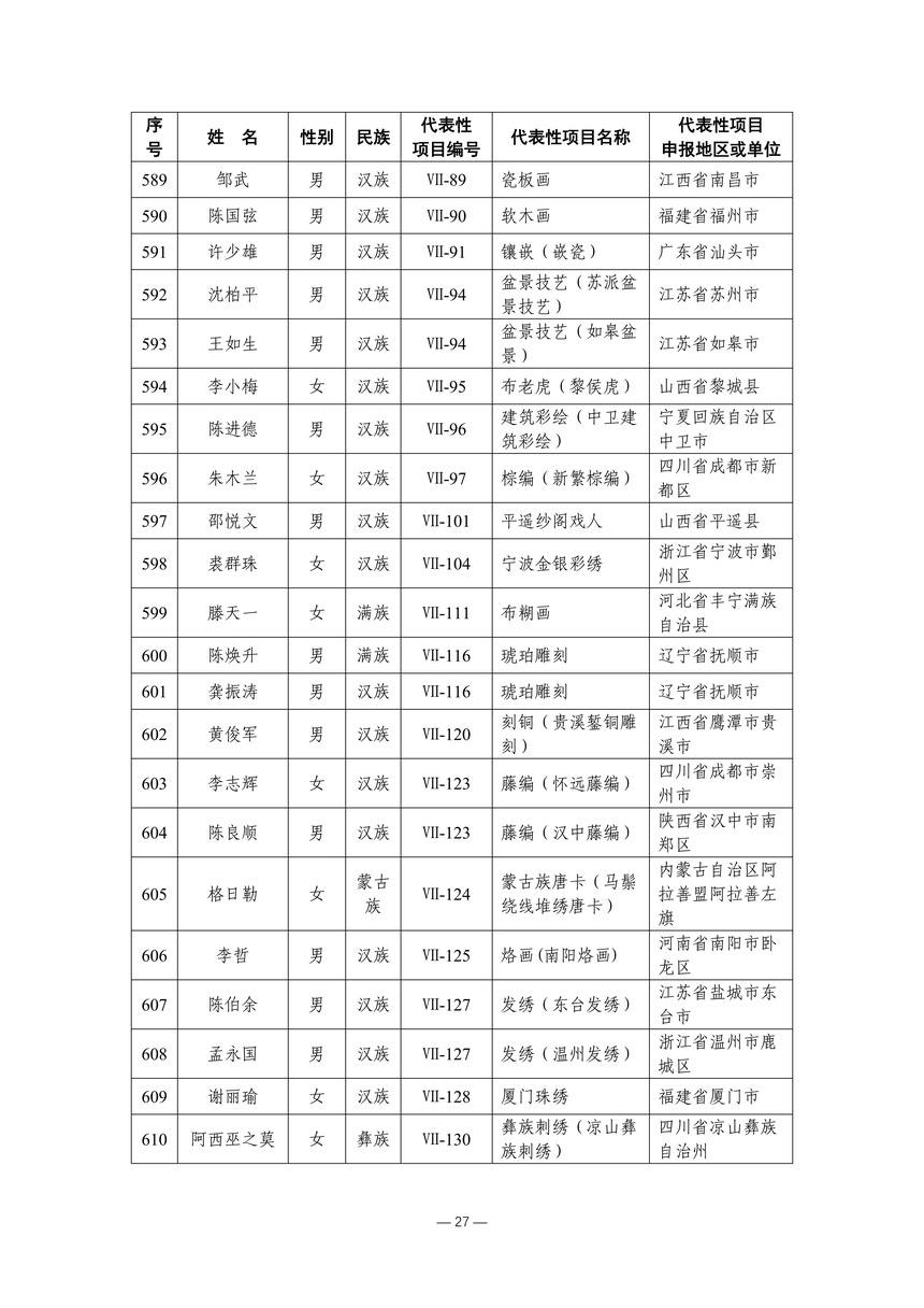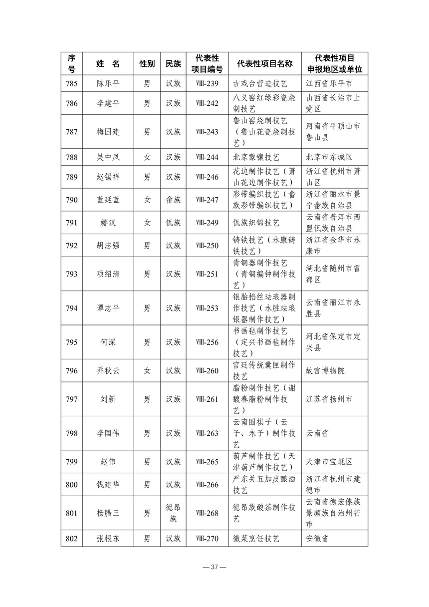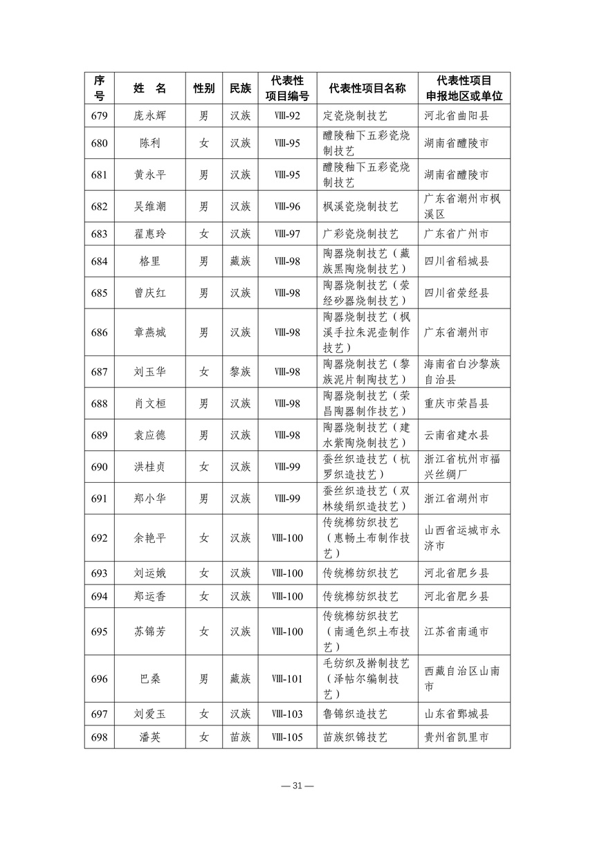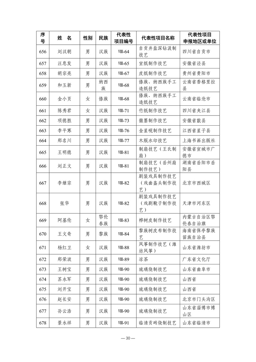 习近平总书记高度重视非物质文化遗产保护传承,强调要积极培养传承人,一代一代接下来、传下去。近年来,各地高度重视非物质文化遗产代表性传承人队伍建设,涌现出一大批德艺双馨、技艺精湛,在非物质文化遗产保护传承中发挥重要作用的典型代表。根据《中华人民共和国非物质文化遗产法》及《国家级非物质文化遗产代表性传承人认定与管理办法》有关规定,为加强非物质文化遗产传承人队伍建设,进一步提升非物质文化遗产系统性保护能力水平,保护和传承好非物质文化遗产,文化和旅游部组织开展第六批国家级非物质文化遗产代表性传承人认定工作。经推荐申报、材料复核、专家初评、社会公示、评审委员会审议等程序,确定了第六批国家级非物质文化遗产代表性传承人名单(942人),现予以公布。