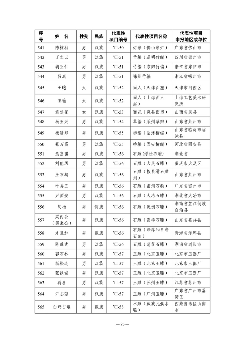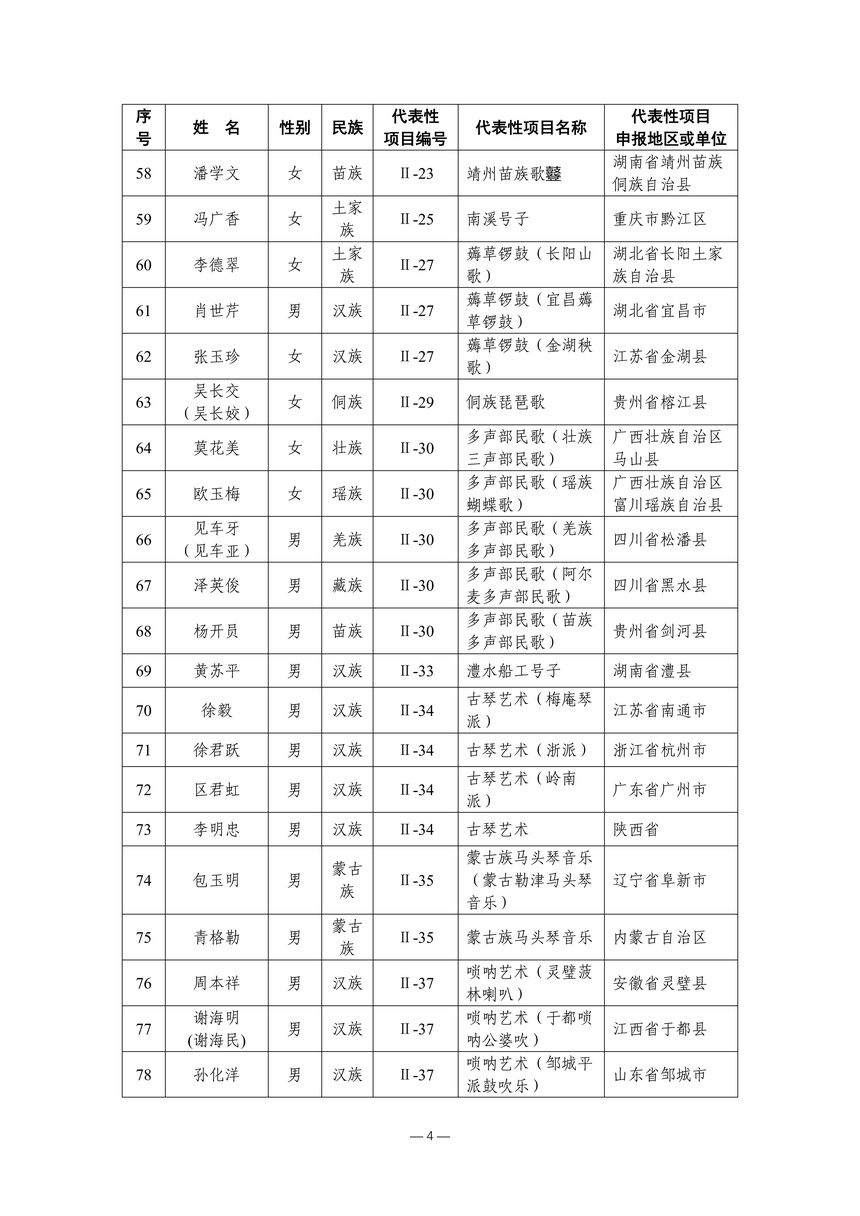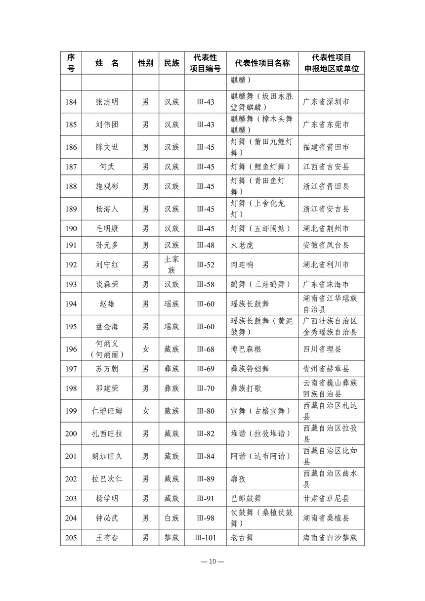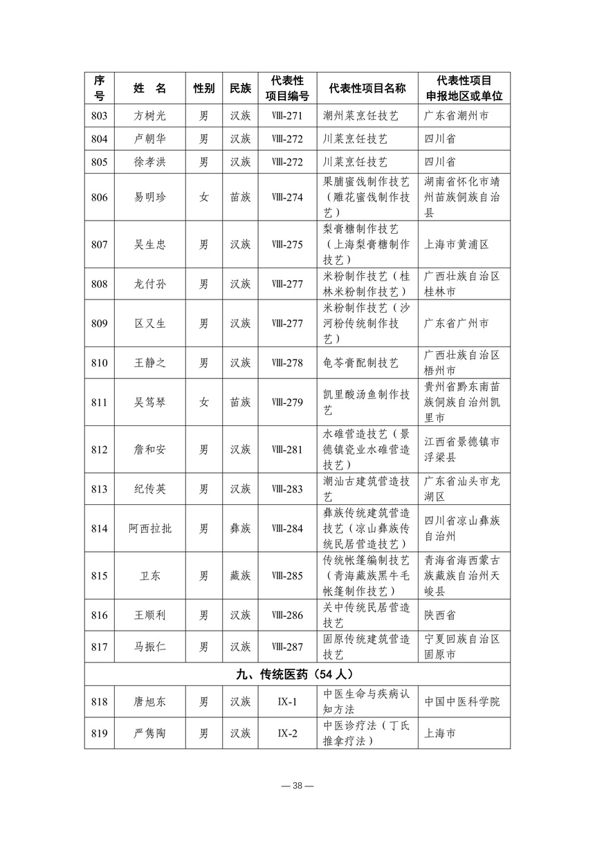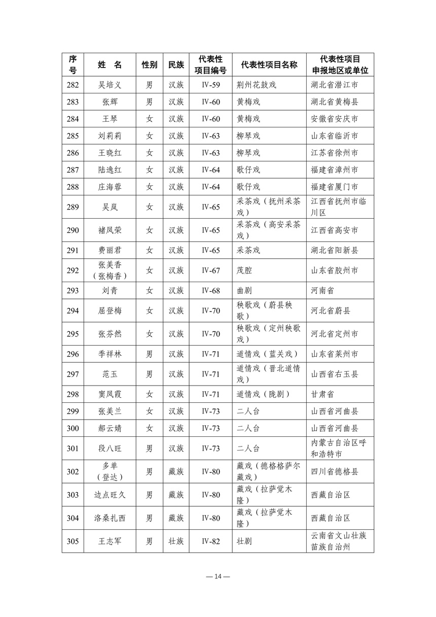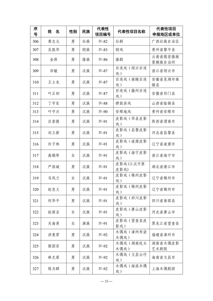 习近平总书记高度重视非物质文化遗产保护传承,强调要积极培养传承人,一代一代接下来、传下去。近年来,各地高度重视非物质文化遗产代表性传承人队伍建设,涌现出一大批德艺双馨、技艺精湛,在非物质文化遗产保护传承中发挥重要作用的典型代表。根据《中华人民共和国非物质文化遗产法》及《国家级非物质文化遗产代表性传承人认定与管理办法》有关规定,为加强非物质文化遗产传承人队伍建设,进一步提升非物质文化遗产系统性保护能力水平,保护和传承好非物质文化遗产,文化和旅游部组织开展第六批国家级非物质文化遗产代表性传承人认定工作。经推荐申报、材料复核、专家初评、社会公示、评审委员会审议等程序,确定了第六批国家级非物质文化遗产代表性传承人名单(942人),现予以公布。