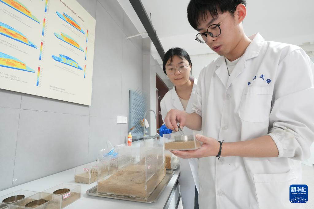在良渚古城遗址世界遗产检测管理中心,科研人员在做遗址复原展示面蚁狮病害物理防治实验(4月18日摄)。