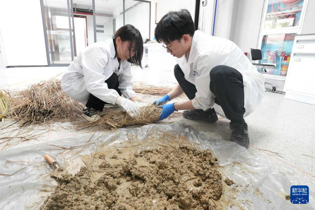 在良渚古城遗址世界遗产检测管理中心,科研人员进行“草裹泥”(良渚水利系统建筑工艺)复原及裂化实验(4月18日摄)。