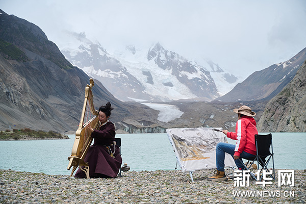 在祥格拉冰川,西藏中国高原画派研究院院长、西藏自治区美术家协会名誉主席唐天源(右)现场写生,中央民族乐团著名箜篌演奏家吴琳(左)演奏箜篌,达成艺术共鸣。