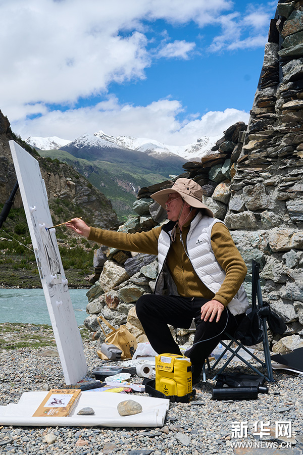 西藏中国高原画派研究院院长、西藏自治区美术家协会名誉主席唐天源在祥格拉冰川现场写生