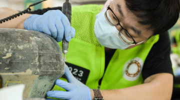 巡查间隙,曾祥余检查伙伴“小小”的状况(6月14日摄)。