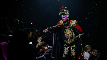 2月23日,在土库曼斯坦阿什哈巴德,川剧变脸演员在“欢乐春节·丝路欢歌”演出上与观众互动。