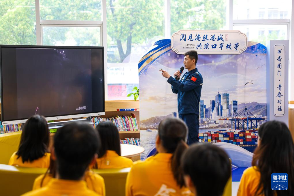 4月21日,在温州市瓯海区警营城市书房,温州海警局执法员赵海然在“真人图书馆”活动中与青年学生分享自己执行任务时的故事。