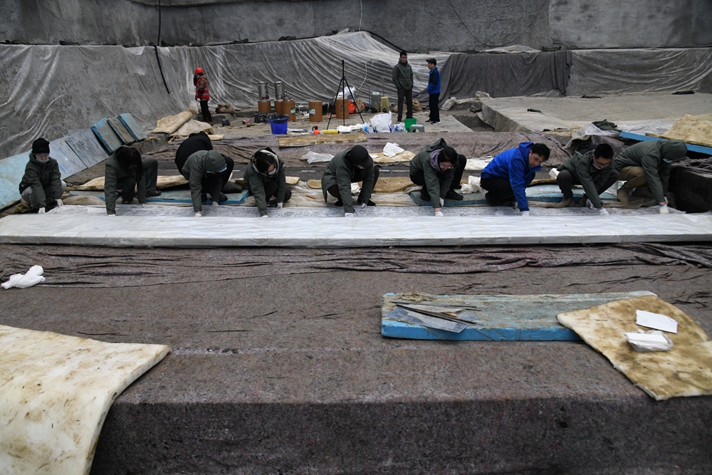 再比如,在安徽淮南武王墩一号墓考古项目中,国家文物局考古研究中心负责出土文物现场保护与多学科研究,在技术、方法上也做了一些新的探索。现场保护方面,我们将薄荷醇应用于潮湿环境,成功提取了200余平方米覆盖在椁盖板上的竹席,是目前国内外开展的面积最大的古代竹席提取工作。首次采用水凝胶、环氧树脂碳纤维布复合材料配合套箱技术,在田野考古发掘现场完成大型文物加固提取。