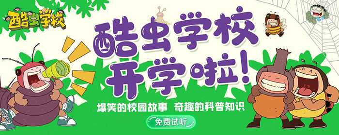 根据原创昆虫科普知识爆笑校园漫画改编的《酷虫学校科普有声故事》,以爆笑幽默的校园故事、新奇有趣的科普知识、广播剧标准的精心制作等特点,激发小读者对大自然的热爱,建立生态文明的宏观观念。