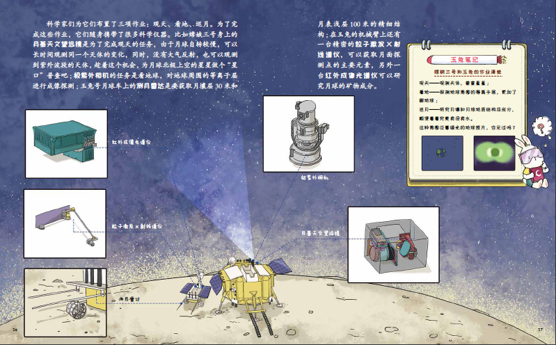 《哇哦,月球》以小问题的形式讲述月球的起源、基本情况以及与地球的关系。用浅显易懂的语言,生动逼真的插画,帮助孩子更好地理解知识。在《飞吧,嫦娥》中,作者用通俗易懂的方式讲述我国为什么要实施月球探测工程?嫦娥一号绕月探测卫星是怎么研制出来的,它携带了哪些科学探测仪器,完成了什么样的探测目标?还有嫦娥二号、三号以及四号各自的运转轨迹,运行中遇到的问题和我国的航天专家是如何解决这些问题的。