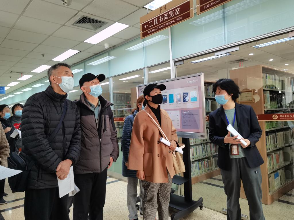 图书馆里的志愿者老师带领老人游览图书馆,并用英语进行讲解。新华社记者汪海月摄