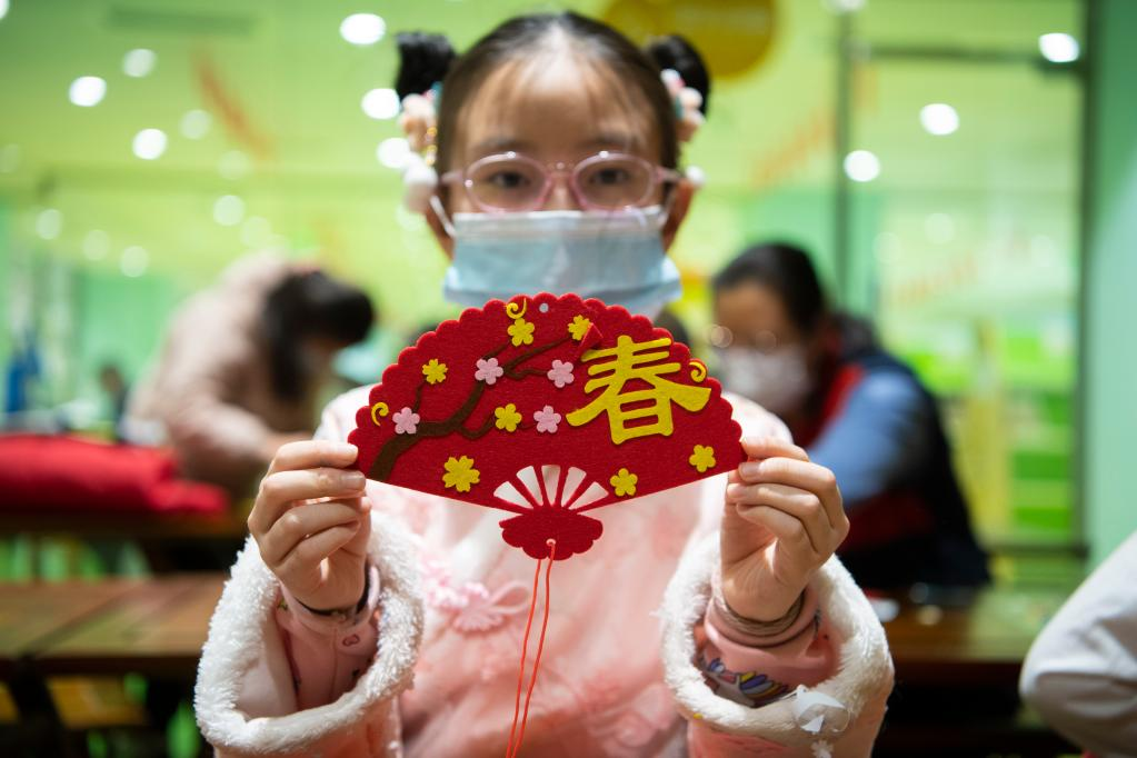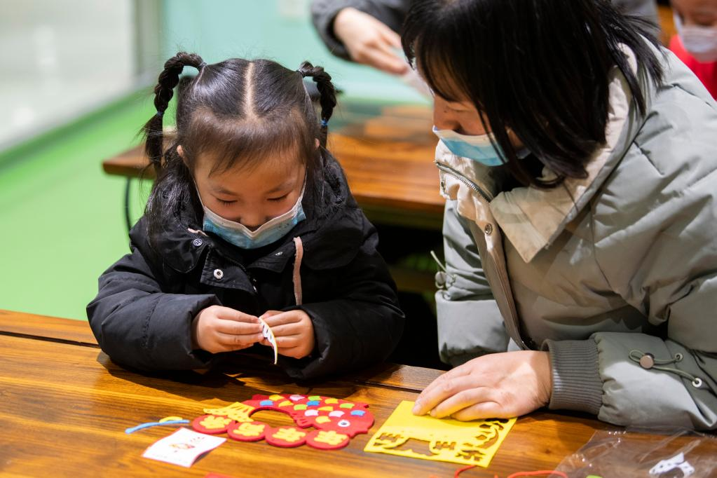2月6日,小朋友和家长在太原市图书馆参加“巧手迎新春”手工DIY活动。