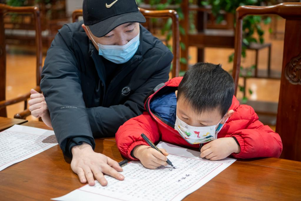 2月6日,小朋友和家长在太原市图书馆参加“观四库 抄经典”活动。