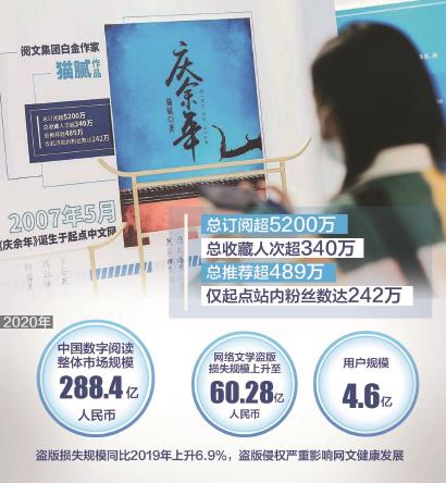 有数据显示,2020年中国网络文学市场规模为288.4亿元,网络文学通过IP全版权运营间接或直接影响了动漫、音乐、影视、游戏等合计约2531亿元的市场,对数字文化产业的影响范围超过40%。但令人痛心的是,2020年中国网络文学盗版损失规模达60.28亿元,同比上升6.9%。