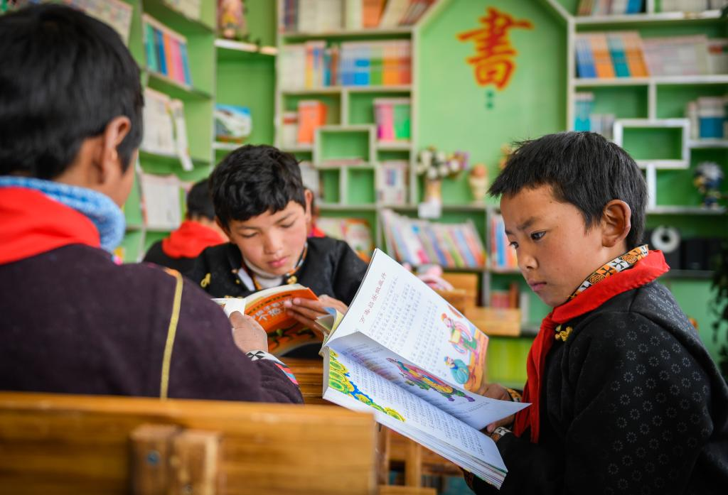 西藏林芝市工布江达县仲莎乡中心小学低年级学生在校图书室内阅览书籍(2018年4月摄)。新华社发