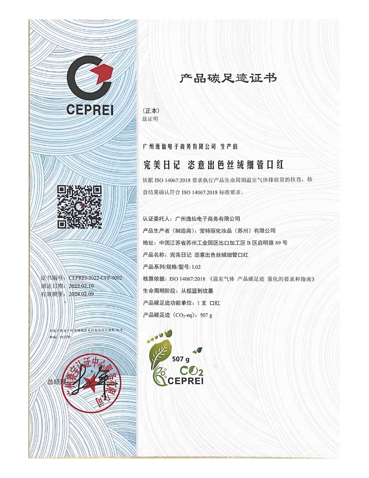 完美日记小细跟口红(L02色号)产品碳足迹证书