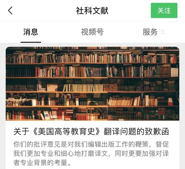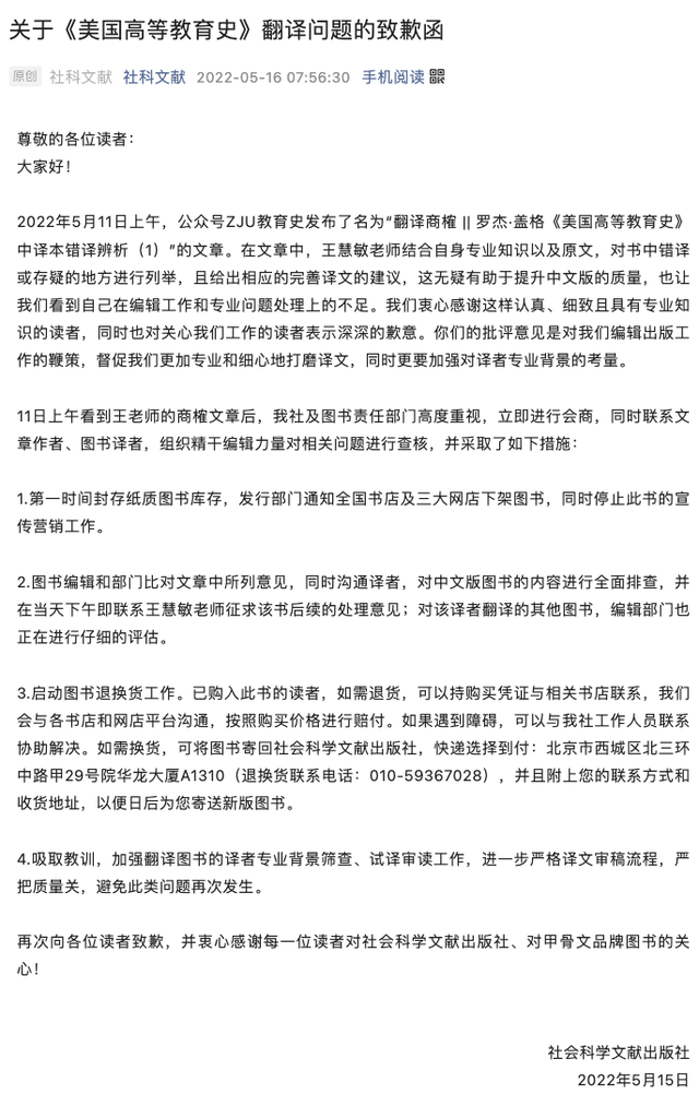 5月16日,社会科学文献出版社官方微信“社科文献”发布“关于《美国高等教育史》翻译问题的致歉函”。