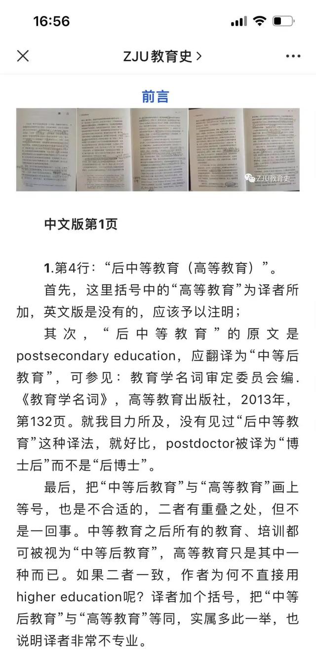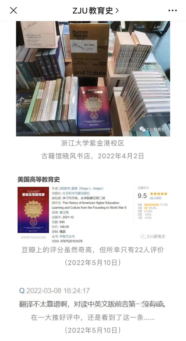 中国青年报注意到,浙江大学教育学院王慧敏副教授在该公众号上发文称,“待我打开《美国高等教育史》中译本拜读之后,我之前的所有好感皆烟消云散”“错译遍布全书(几乎每一页)。”